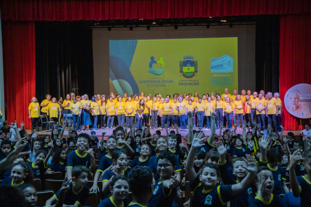 Projeto Vozes, de Londrina, com mais de 100 vozes da terceira idade leva música, arte e emoção a uma plateia formada por idosos do Centro Dia e alunos da rede municipal de ensino de Apucarana