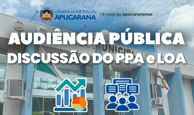 A Câmara Municipal de Apucarana convida toda a população para participar da Audiência Pública de discussão do Plano Plurianual (PPA) e da Lei Orçamentária Anual (LOA), que será realizada no dia 9 de dezembro, às 19h, no plenário da Casa de Leis.