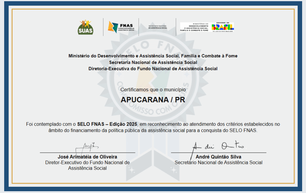 Esta é a primeira edição do Selo FNAS. A conquista posiciona Apucarana como referência na gestão da Assistência Social, reafirmando o cuidado com a população, a responsabilidade na gestão pública e a busca permanente por serviços cada vez mais eficientes.
