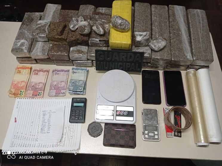 Chegando na casa da mulher, a GM localizou na cozinha pedaços de maconha e no quarto, foram encontradas 33 porções da mesma droga, pesando posteriormente 17,047kg. Foi encontrado também em sua residência R$263 em dinheiro trocado, uma máquina de cartão, uma balança SF 400, uma balança OLIM, papel filme, anotações que caracteriza o crime de tráfico de drogas e dois celulares de propriedade dos encaminhados.