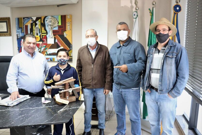 O prefeito Sérgio Onofre recebeu a visita do aluno Gustavo Rodrigues Russo, do 4º ano da Escola Municipal Papa João Paulo II, nesta segunda-feira (5) e o estudante apresentou o brinquedo intitulado “bate-bolinha” – desenhado e construído por ele, com a auxilio do pai, Vicente Russo.