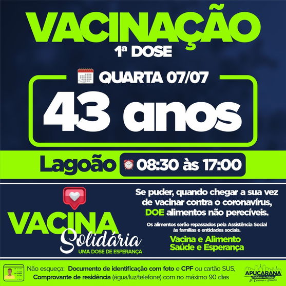 Na sexta-feira (9), o esquema de vacinação é para segunda dose da vacina. Serão vacinadas as pessoas com 66 anos. A Saúde de Apucarana destaca que podem procurar o posto de vacinação no Lagoão todas as pessoas que tiverem segunda dose agendada até o dia 9 de julho, independente da idade.