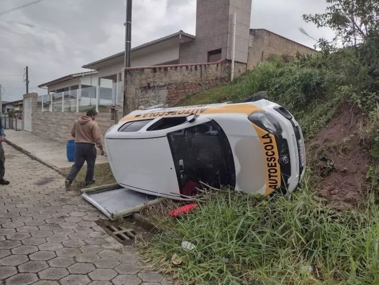 Ao fazer a baliza durante a prova final para a Carteira Nacional de Habilitação (CNH), uma mulher, de 50 anos, capotou o carro da auto escola, em Gaspar, no Vale do Itajaí, em Santa Catarina. O caso aconteceu nesta última terça-feira (6).