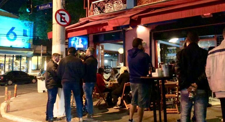 Em um dos estabelecimentos, a reportagem chegou a contar 40 pessoas concentradas em uma calçada apertada. No bar ao lado, mais 20 pessoas.