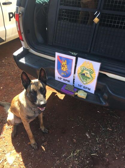 Foi acionado apoio da equipe Canil, que localizou com os cães de faro cerca de 500 gramas de maconha.