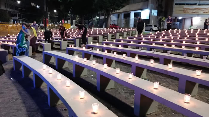 Moradores de Londrina, que integram entidades e movimentos sociais, realizaram uma homenagem às vítimas do novo coronavírus, na noite desta terça-feira (13). Velas foram acesas nas arquibancadas da Concha Acústica, na área central da cidade.