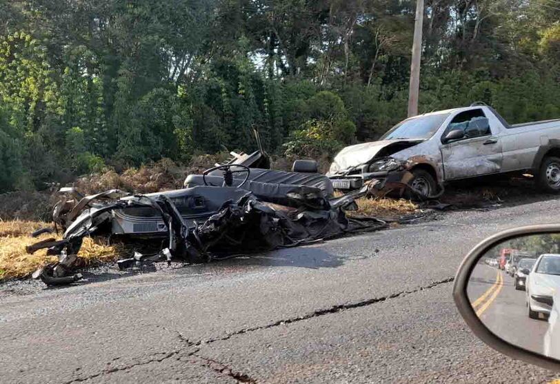 A caminhonete F 1000 ficou destruída, o motorista que sofreu ferimentos graves, foi encaminhado ao Hospital São Vicente de Paulo, em Pitanga.