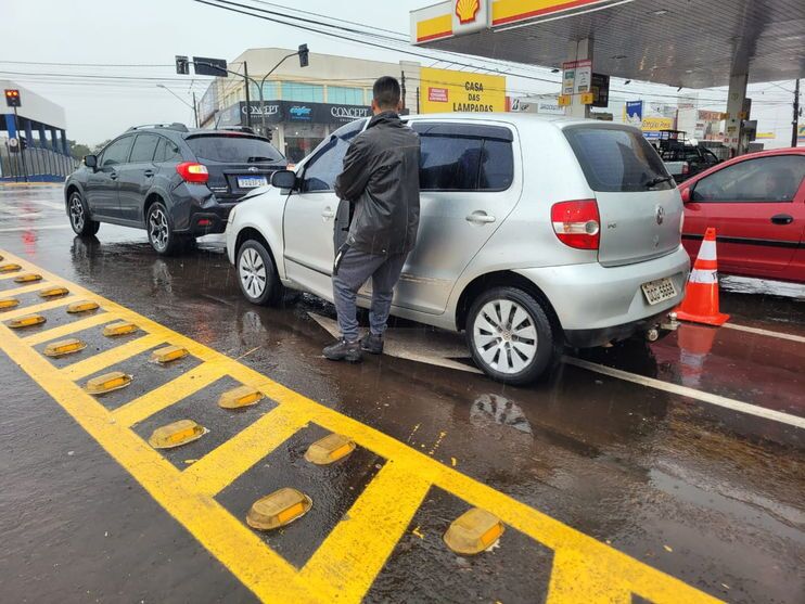 Um Fox bateu na traseira de um Subaru na parada do semáforo localizado na esquina da Rua São João com a Avenida Minas Gerais, em Apucarana, no começo da tarde desta sexta-feira (16).