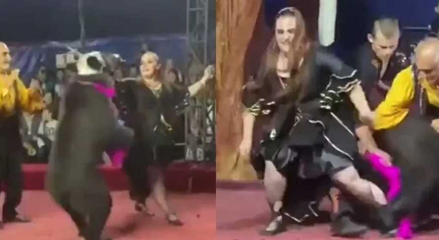 Dois funcionários do circo tentaram conter o urso, mas um segundo ataque foi iniciado contra a mulher, que chega a tentar se equilibrar em um pé enquanto o outro estava na boca do animal selvagem.