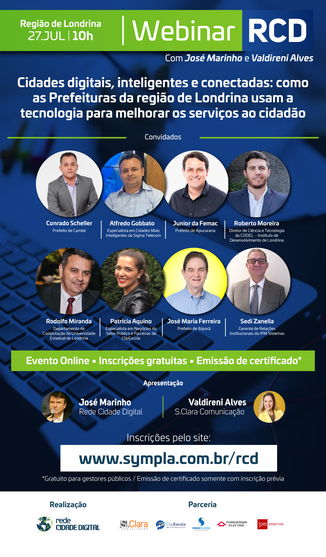 As inscrições para o Webinar das Cidades Digitais da Região de Londrina são gratuitas para servidores públicos e representantes de entidades/universidades e devem ser feitas pelo http://sympla.com.br/rcd. O evento tem a parceria da S. Clara Comunicação, ClipEscola, Sigma Telecom, Furukawa e IPM Sistemas.