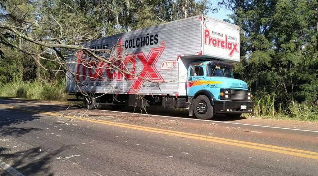 O motorista de caminhão precisou trafegar pelo acostamento para desviar dos galhos. Condutores acionaram a prefeitura, que encaminhou uma equipe, que já providenciou o corte e remoção dos galhos.