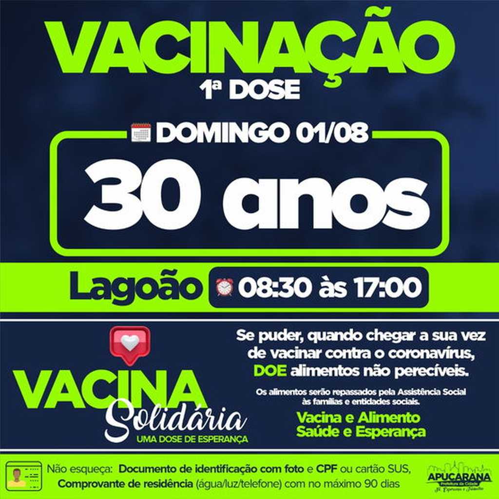 Já no domingo (1º) ,serão vacinadas as pessoas com 30 anos completos. "Vamos iniciar o mês vacinando todas as pessoas com 30 anos, não se esqueçam do comprovante de residência e documento com foto", disse Junior da Femac.
