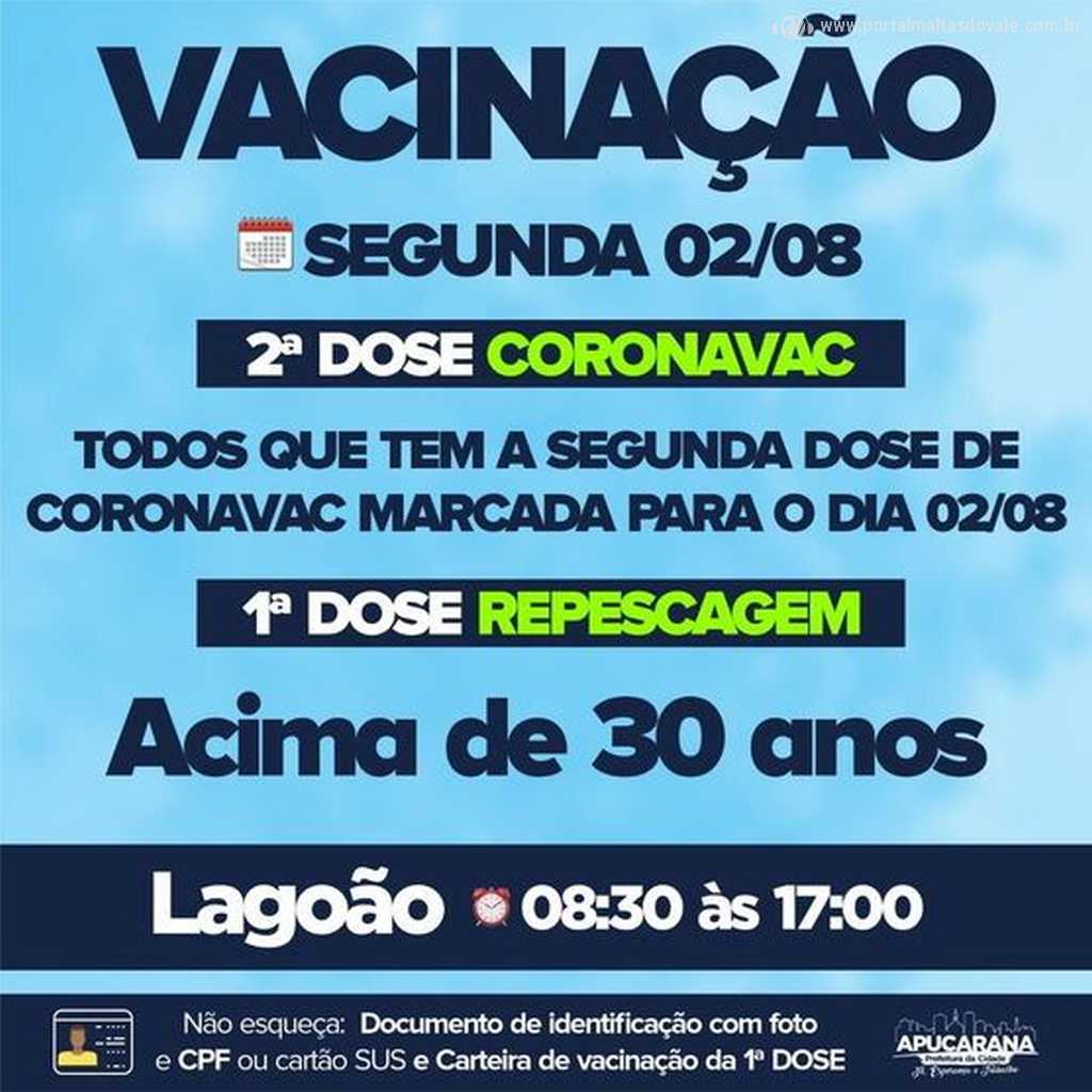 Também serão vacinadas pessoas que tem direito a segunda dose da Coronavac, com retorno marcado para o dia 02/08.