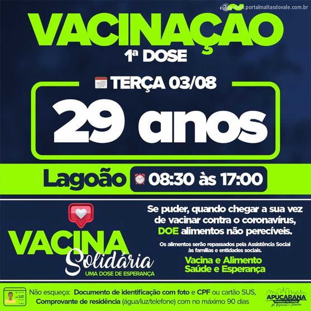 Nesta terça-feira (03) Apucarana imuniza com a primeira dose as pessoas de 29 anos. Na quarta-feira (04) serão imunizadas pessoas de 28 anos.