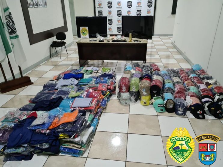 Na madrugada desta quinta-feira (5), a Polícia Militar de Apucarana recebeu uma denúncia anônima informando que pessoas estariam em uma casa descarregando objetos suspeitos no Jardim Morada do Sol.Durante a operação, uma mulher, de 48 anos, que estava no local denunciado, foi encaminhada para a delegacia, além de terem sido recuperados quase dois mil bonés e camisetas; 46 cheques, R$ 1.155 e duas TV’s, que foram levados de uma empresa localizada no Jardim Catuaí III. Os criminosos, conforme a PM, também roubaram um VW/Parati e amarram um dos funcionários do local dentro do banheiro. Diante da denúncia, a equipe se deslocou e quando se aproximou do local, conforme o boletim, dois homens fugiram pelos fundos sentido à Rua Mario Panont e depois para uma mata que li8ga ao Jardim das Flores. Outras equipes foram até o endereço, mas não conseguiram localizar os suspeitos.Na casa, a PM conversou com uma mulher, que disse ser mãe de um homem já conhecido no meio policial. Ela deixou a polícia entrar na residência, onde foi encontrado um VW/PARATI, o qual estava com um mixa na ignição, além de 754 camisetas e 1.140 de diferentes marcas.Ainda dentro da casa, a PM encontrou uma TV da marca LG 32 polegadas, uma porção de maconha, pesando 16 gramas, e uma bolsa feminina, com grande valor em dinheiro, totalizando R$1155, além de cheques de diversos valores. De acordo com a PM, ainda dentro da casa, havia um simulacro de pistola e um revolver, possivelmente calibre 32, uma touca balaclava, um perfume e carregadores de celular.No andar debaixo da casa, de acordo com a PM, foi localizada mais uma quantidade grande de bonés, camisetas e uma TV da marca Samsung de 40 polegadas. Ao ser indagada, a mulher, de 48 anos, afirmou que ouviu o momento em que o veículo entrou na garagem e seu filho foi receber dois homens, um deles conhecido no meio policial pela pratica de furtos.A abordada ainda disse à PM que ouviu eles conversando sobre ter amarrado vítimas e teriam pego a mercadoria. Diante dos fatos, a equipe encaminhou a mulher até a 17ª SDP. Os envolvidos ainda não foram localizados pela polícia.Fonte TNOnline