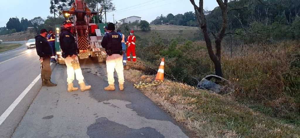 Com o choque, o carro caiu na ribanceira na lateral da pista, bateu em uma árvore e então pegou fogo.