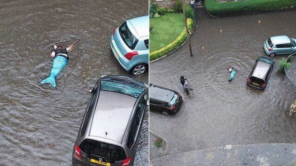 Gavin Millar fotografou o momento da janela de seu apartamento e postou a foto em uma rede social. O post teve vários comentários e grande parte dos internautas achou a situação engraçada. Já outras pessoas comentaram sobre a saúde da "sereia", que estaria nadando em um local sujo.