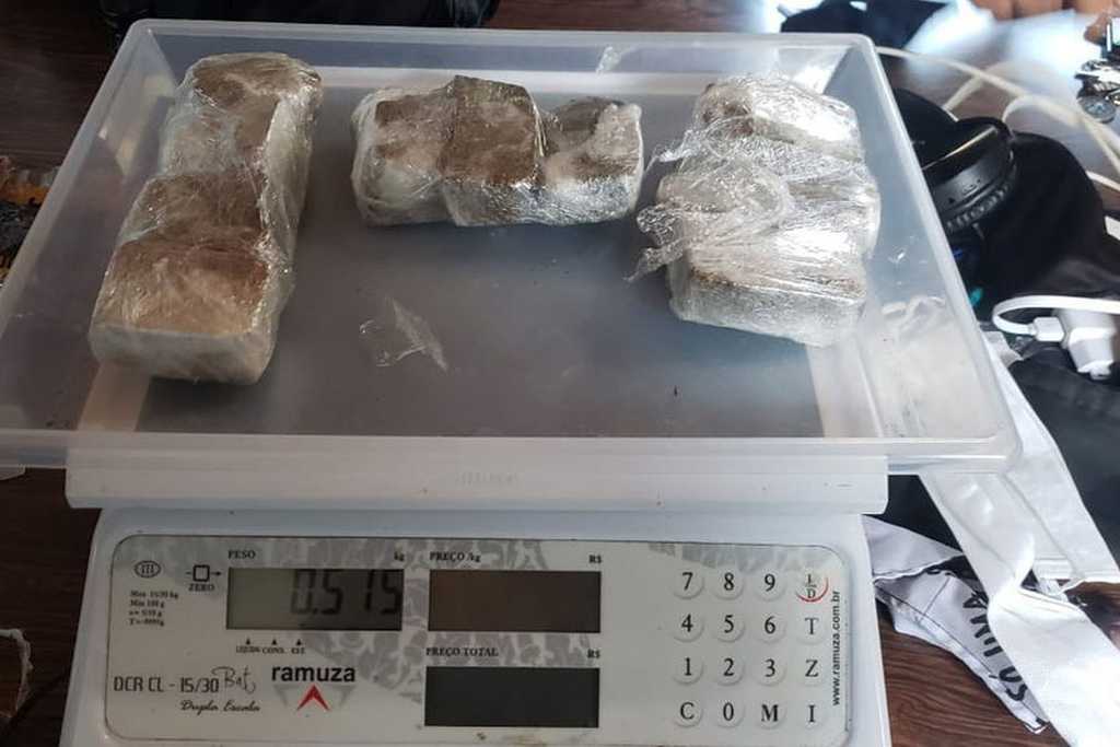 Com o servidor foram encontrados 515 gramas de maconha, um aparelho celular, um carregador de celular e seis pacotes de fumo caiçara.