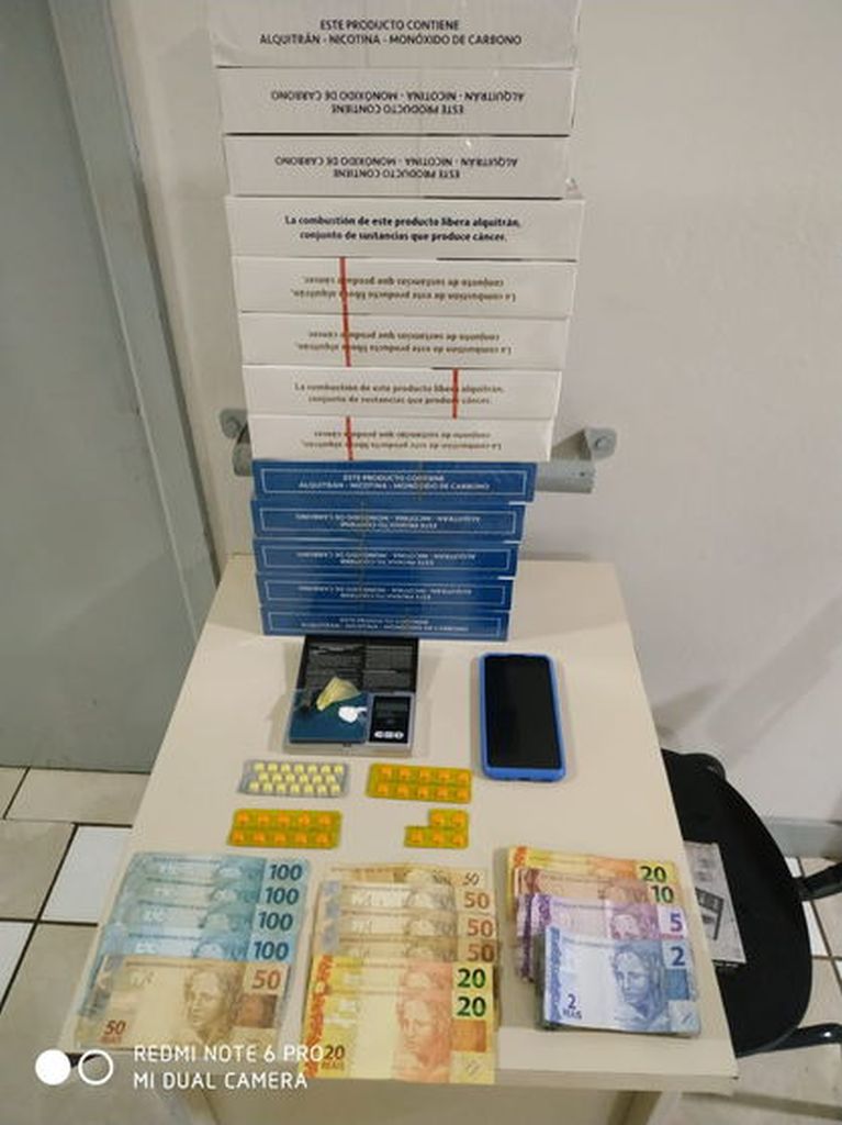 Ainda de acordo com a PM, foram encontradas 13 caixas de cigarros contrabandeados. Uma balança de precisão foi apreendida, além de dinheiro que seria ilícito.