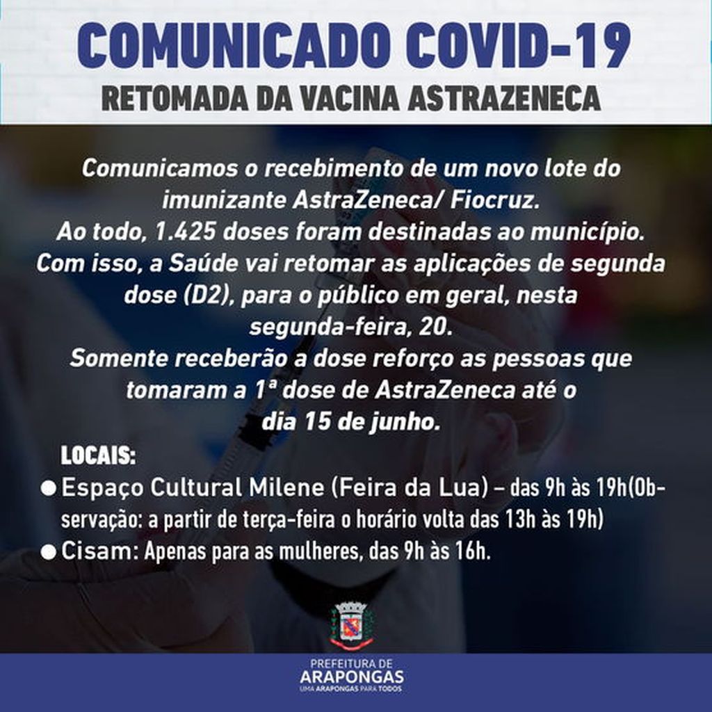 Após a chegada de um novo lote, Arapongas comunica o retorno da vacinação com AstraZeneca, nesta segunda-feira (20).