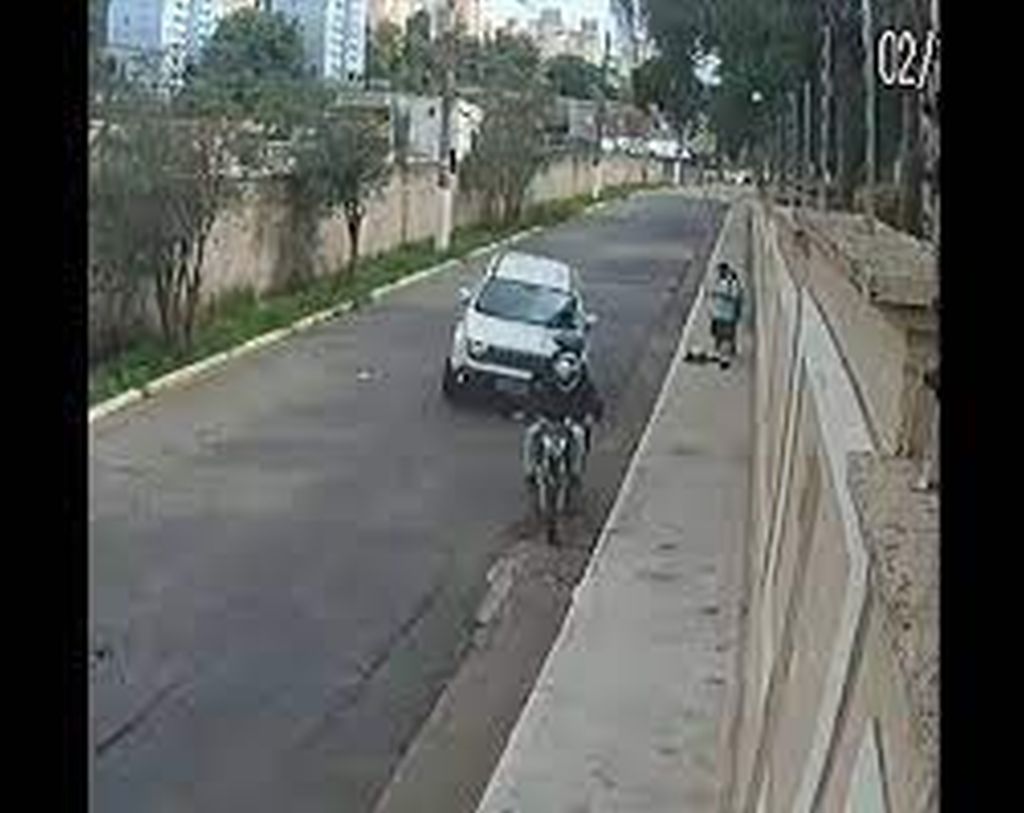 Nas imagens é possível ver que os dois pedestres levantam os braços imediatamente, acuados. Com medo, a mulher chega a derrubar no chão a blusa que carregava. Neste momento, um motorista de um Jeep Renegade que passava pelo local, acerta em cheio os criminosos ao perceber o assalto.