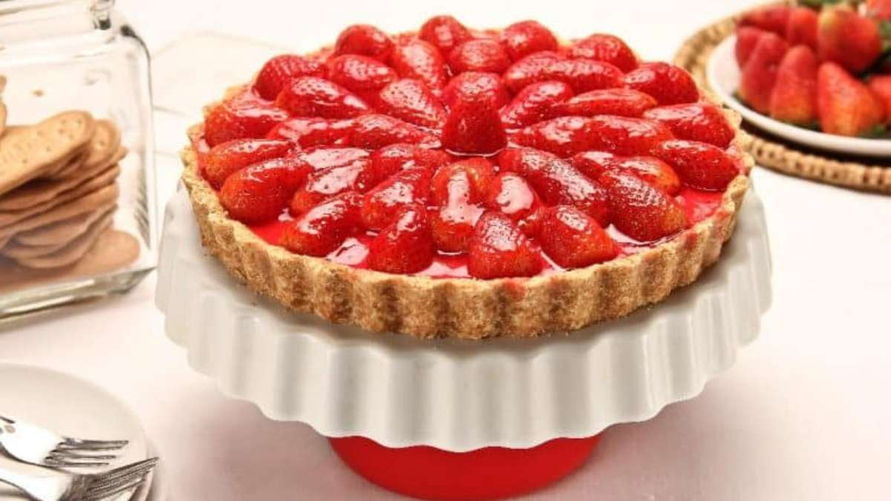 RECHEIO :Leve ao fogo o leite, leite condensado, essência de baunilha , amido de milho e as gemas peneiradas. Misture bem, mexa até formar um creme deixe amornar e junte o creme de leite. Coloque o creme na forma por cima da massa já assada. Lave bem os morangos e pique em fatias no sentido do comprimento. Arrume por cima do creme, reserve. Faça a gelatina com 350 ml de água deixe gelar até que fique num aspecto grossa, que escorra ainda da colher e coloque devagar por cima dos morangos. Leve à geladeira para acabar de endurecer. Desenforme. Sirva gelada.