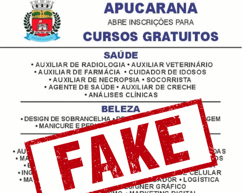 A Prefeitura de Apucarana faz um alerta à população sobre a circulação de uma notícia falsa nas redes sociais, que utiliza indevidamente o nome do poder público municipal para oferecer supostos cursos gratuitos de capacitação profissional nas áreas de saúde, beleza, indústria e produção, com promessa de estágio garantido.