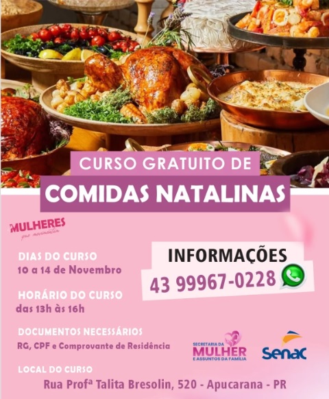 O curso acontecerá de 10 a 14 de novembro, das 13 às 16 horas, na nova sede da Secretaria da Mulher, localizada na Rua Professora Talita Bresolin, nº 520. As vagas são limitadas e as interessadas devem ter mais de 16 anos. “Durante as aulas, serão ensinadas receitas tradicionais de ceias natalinas, com foco em técnicas culinárias práticas e economicamente acessíveis”, relata Karine Mota, secretária municipal da Mulher e Assuntos da Família. No ato da inscrição deve ser apresentado RG, CPF e comprovante de residência. Mais informações e inscrições para este curso podem ser obtidas pelo telefone/WhatsApp (43) 99967-0228.